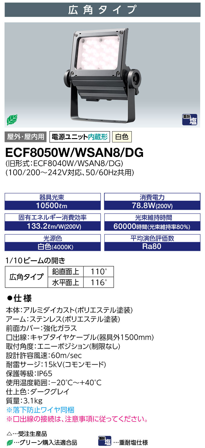 ECF8050W/WSAN8/DG || LEDÅê¸÷´ï ´äºêÅŵ¤ ¥ì¥Ç¥£¥ª¥Ã¥¯¥Õ¥é¥Ã¥É¥Í¥ª[80¥¯¥é¥¹] ¹³Ñ¥¿¥¤¥× Ãæ·¿¥µ¥¤¥óÍÑ ²°Æâ³°·óÍÑ IP65 ÅŸ»Æâ¢ ½ÅÂѱö»ÅÍÍ Çò¿§(4000K) 10500lm Ra80 100/200¡Á242V ¾ÃÈñÅÅÎÏ(78.8W/200V»þ) ¥À¡¼¥¯¥°¥ì¥¤ (µìECF8040W/WSAN8/DG)¡Ú¼õÃíÀ¸»ºÉÊ¡Û[br]¤Ë¤Ä¤¤¤Æ¤Ä¤Ö¤ä¤¯