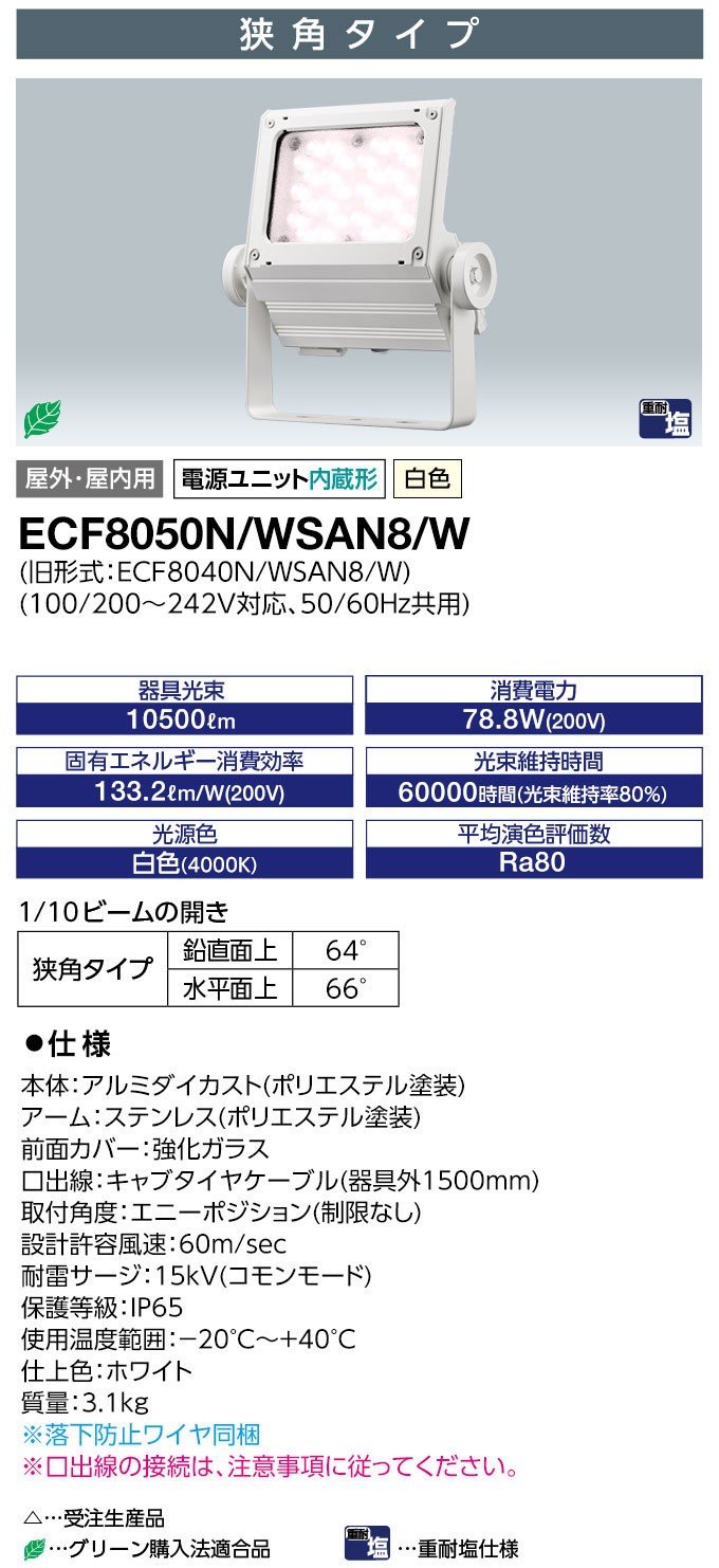 ECF8050N/WSAN8/W || LEDÅê¸÷´ï ´äºêÅŵ¤ ¥ì¥Ç¥£¥ª¥Ã¥¯¥Õ¥é¥Ã¥É¥Í¥ª[80¥¯¥é¥¹] ¶¹³Ñ¥¿¥¤¥× Ãæ·¿¥µ¥¤¥óÍÑ ²°Æâ³°·óÍÑ IP65 ÅŸ»Æâ¢ ½ÅÂѱö»ÅÍÍ Çò¿§(4000K) 10500lm Ra80 100/200¡Á242V ¾ÃÈñÅÅÎÏ(78.8W/200V»þ) ¥Û¥ï¥¤¥È (µìECF8040N/WSAN8/W)¡Ú¼õÃíÀ¸»ºÉÊ¡Û[br]¤Ë¤Ä¤¤¤Æ¤Ä¤Ö¤ä¤¯