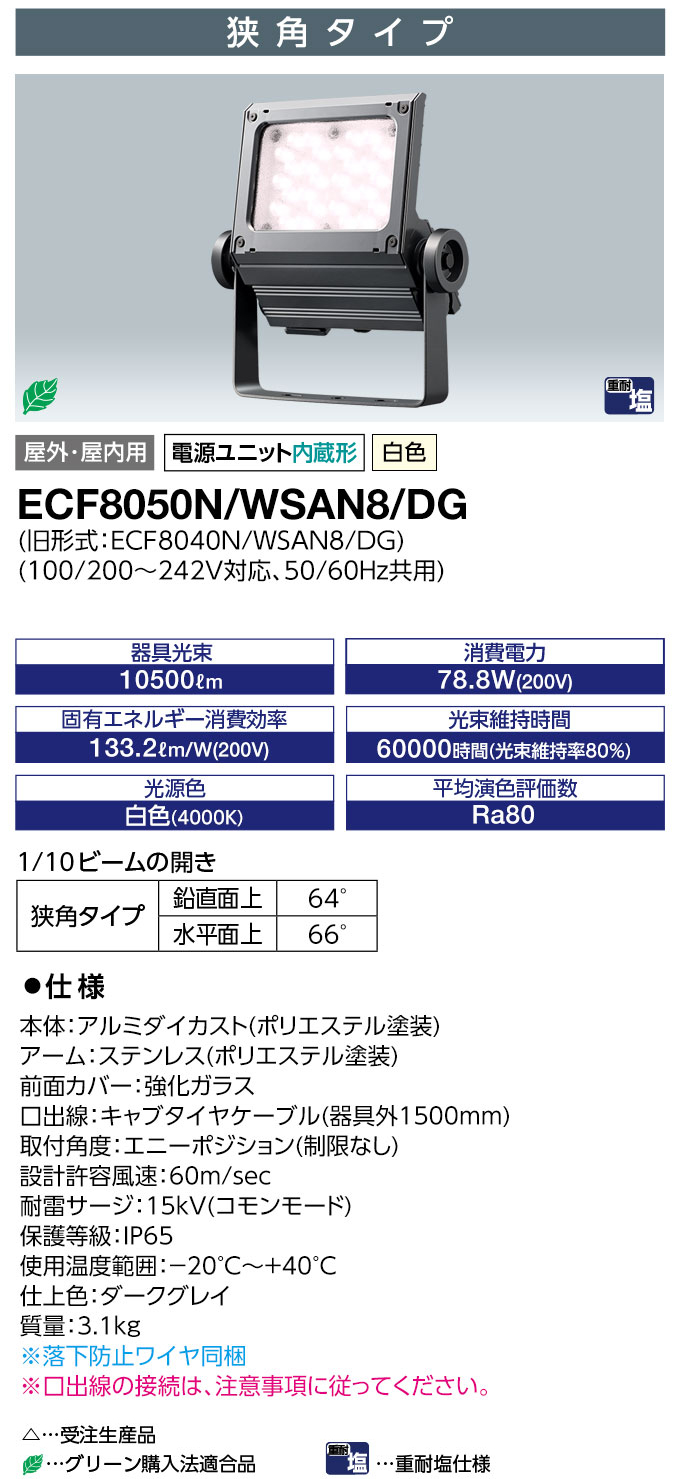 ECF8050N/WSAN8/DG || LEDÅê¸÷´ï ´äºêÅŵ¤ ¥ì¥Ç¥£¥ª¥Ã¥¯¥Õ¥é¥Ã¥É¥Í¥ª[80¥¯¥é¥¹] ¶¹³Ñ¥¿¥¤¥× Ãæ·¿¥µ¥¤¥óÍÑ ²°Æâ³°·óÍÑ IP65 ÅŸ»Æâ¢ ½ÅÂѱö»ÅÍÍ Çò¿§(4000K) 10500lm Ra80 100/200¡Á242V ¾ÃÈñÅÅÎÏ(78.8W/200V»þ) ¥À¡¼¥¯¥°¥ì¥¤ (µìECF8040N/WSAN8/DG)¡Ú¼õÃíÀ¸»ºÉÊ¡Û[br]¡¡80¥¯¥é¥¹ ¶¹³Ñ¥¿¥¤¥× Çò¿§