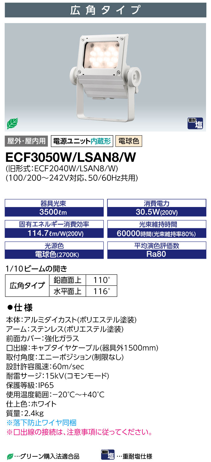 ECF3050W/LSAN8/W || LEDÅê¸÷´ï ´äºêÅŵ¤ ¥ì¥Ç¥£¥ª¥Ã¥¯¥Õ¥é¥Ã¥É¥Í¥ª[30¥¯¥é¥¹] ¹³Ñ¥¿¥¤¥× Ãæ·¿¥µ¥¤¥óÍÑ ²°Æâ³°·óÍÑ IP65 ÅŸ»Æâ¢ ½ÅÂѱö»ÅÍÍ Åŵ忧(2700K) 3500lm Ra80 100/200¡Á242V ¾ÃÈñÅÅÎÏ(30.5W/200V»þ) ¥Û¥ï¥¤¥È (µìECF2040W/LSAN8/W) [br]¡¡30¥¯¥é¥¹ ¹³Ñ¥¿¥¤¥× Åŵ忧