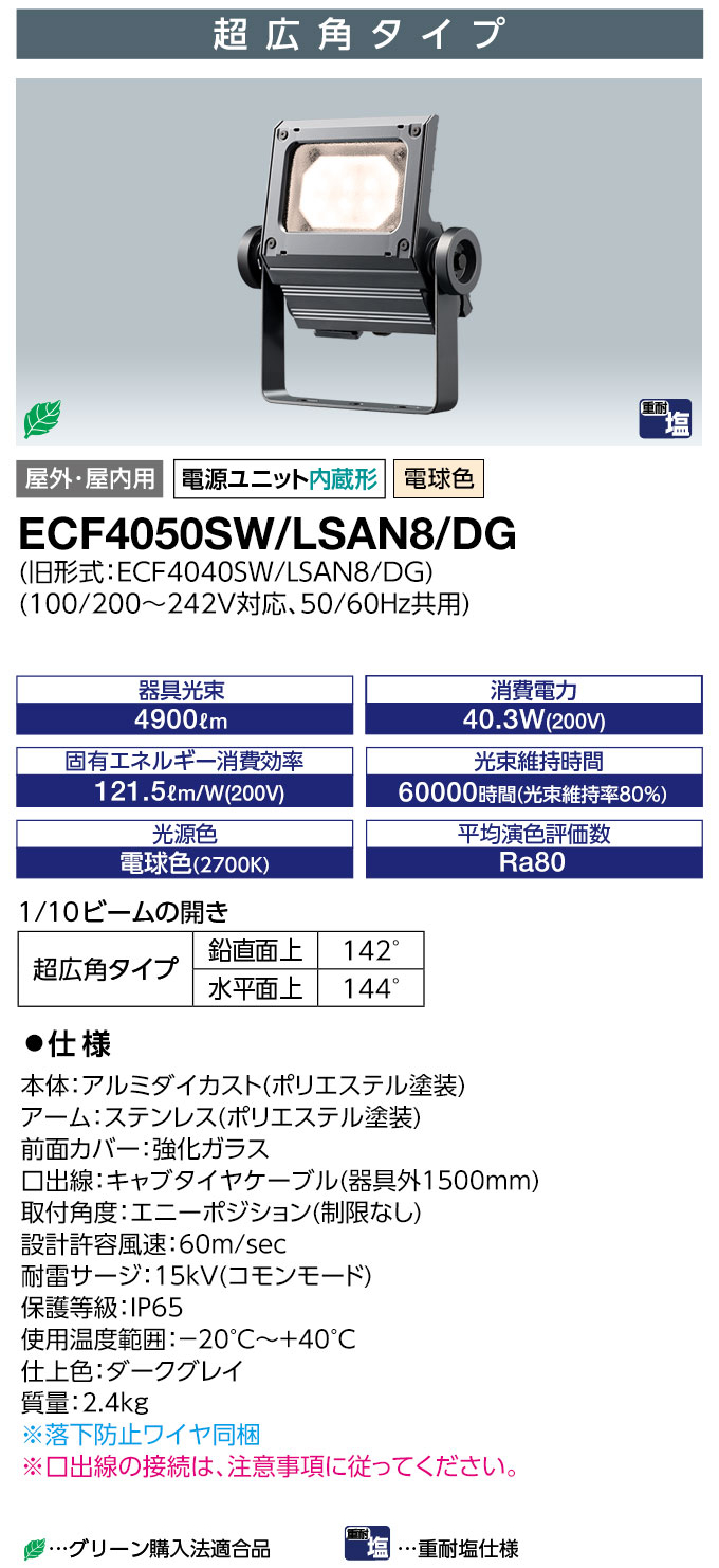 ECF4050SW/LSAN8/DG || LEDÅê¸÷´ï ´äºêÅŵ¤ ¥ì¥Ç¥£¥ª¥Ã¥¯¥Õ¥é¥Ã¥É¥Í¥ª[40¥¯¥é¥¹] ͹³Ñ¥¿¥¤¥× Ãæ·¿¥µ¥¤¥óÍÑ ²°Æâ³°·óÍÑ IP65 ÅŸ»Æâ¢ ½ÅÂѱö»ÅÍÍ Åŵ忧(2700K) 4900lm Ra80 100/200¡Á242V ¾ÃÈñÅÅÎÏ(40.3W/200V»þ) ¥À¡¼¥¯¥°¥ì¥¤ (µìECF4040SW/LSAN8/DG) [br]