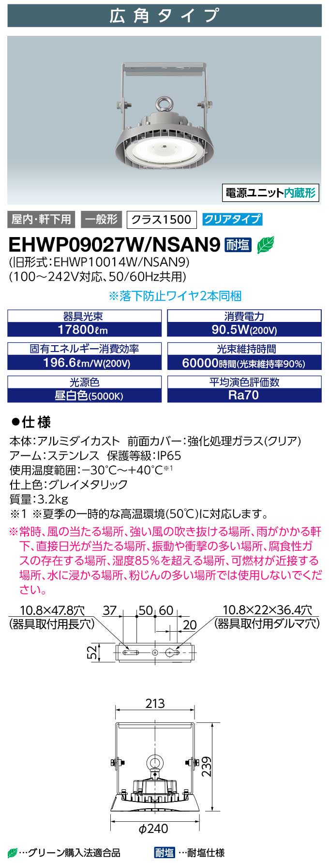 EHWP09027W/NSAN9 || LED¹âÅ·°æÍѾÈÌÀ´ï¶ñ ´äºêÅŵ¤ LEDioc HIGH-BAY¦È(¥¯¥é¥¹1500)<¥¯¥ê¥¢¥¬¥é¥¹> ²°ÆâŽ¥¸®²¼ÍÑ(IP65) ÅŸ»Æâ¢¡ãÂѱö»ÅÍÍ¡ä ¿å¶ä¥é¥ó¥×400WÁêÅö/¥á¥¿¥ë¥Ï¥é¥¤¥É¥é¥ó¥×300WÁêÅö ¹³Ñ ÃëÇò¿§(5000K) 17800lm Ra70 AC100¡Á242V (µì:EHWP10014W/NSAN9) [br]¡¡¥¯¥é¥¹1500 ¥¯¥ê¥¢ ÅŸ»Æâ¢