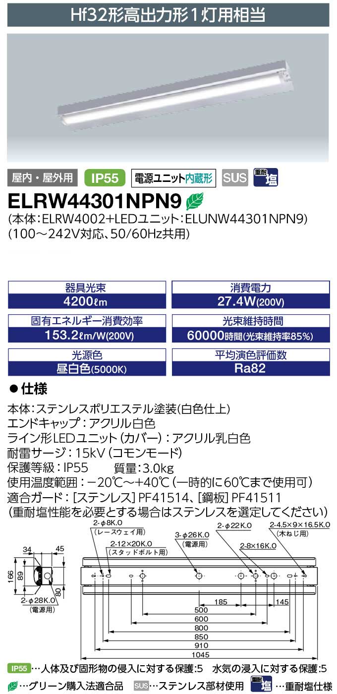 ELRW44301NPN9 || Ëɿ巿LED¥Ù¡¼¥¹¥é¥¤¥È¡ã³ÞÉÕ¡ä ´äºêÅŵ¤ LEDioc MULTILINE¡ã³ÞÉÕ·Á1000mm¥¿¥¤¥×¡ä(¥¹¥Æ¥ó¥ì¥¹) ÅŸ»Æâ¢ ²°Æâ³°·óÍÑ IP55 ½ÅÂѱö Hf32W·Á¹â½ÐÎÏ·Á1ÅôÍÑÁêÅö ÃëÇò¿§(5000K) 4200lm Ra82 AC100¡Á242V ¾ÃÈñÅÅÎÏ(27.4W/200V»þ)¡ÚÂå°úÉԲġÛ[br]¤Ë¤Ä¤¤¤Æ¤Ä¤Ö¤ä¤¯